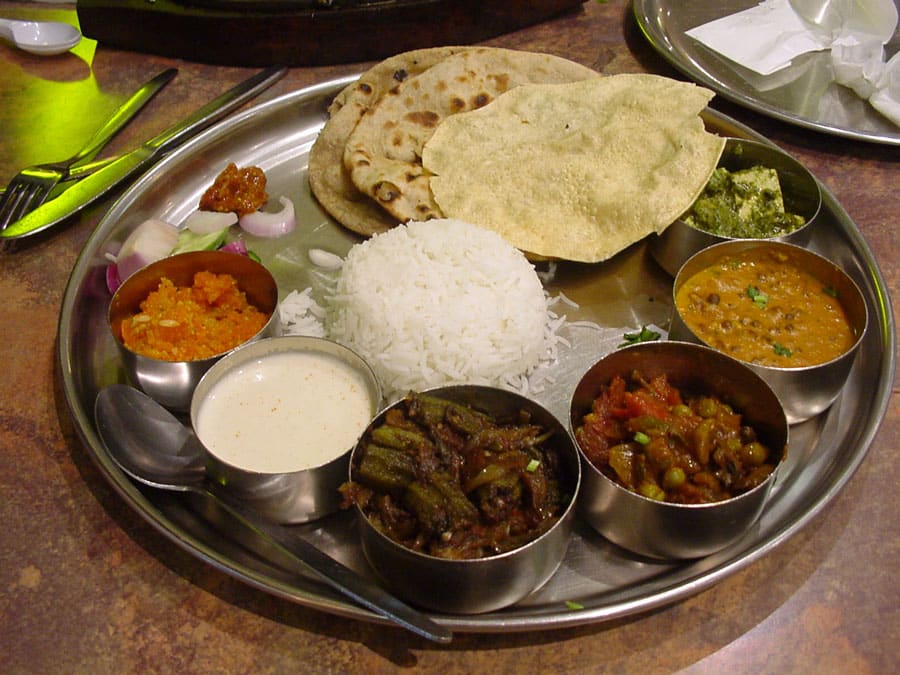 Les repas sont servis tous ensemble (entrée, plats principal, désert) dans le thali. C’est un plateau qui dispose de plusieurs compartiments pour chaque repas. Tous les repas sont souvent accompagnés de pain et sont composés de riz, de lentilles, de légumes, d’épices, de yaourts, de fruits, et d’un dessert. Ce sont là les ingrédients de base, mais les plats varient chaque fois. Les différents modes de préparation sont par exemple le Tandoori, la Tikka, etc. Certains plats sont très épicés, mais on peut aussi trouver des plats avec peu d’épices et de piment.
